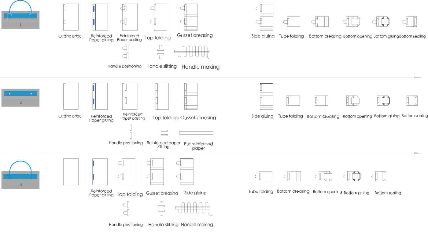 1.Paper handle making、handle pasting、top folding、tube forming、gusset forming、 square bottom open、bottom gluing、bottom pasting、compaction output. 2.Paper handle making、handle pasting(without top folding)、tube forming、gusset forming、 square bottom open、bottom gluing、bottom pasting、compaction output. 3. Reinforce card making、reinforce card pasting、top folding、tube forming、gusset forming、 hole punching、square bottom open、bottom gluing、bottom pasting、compaction output.